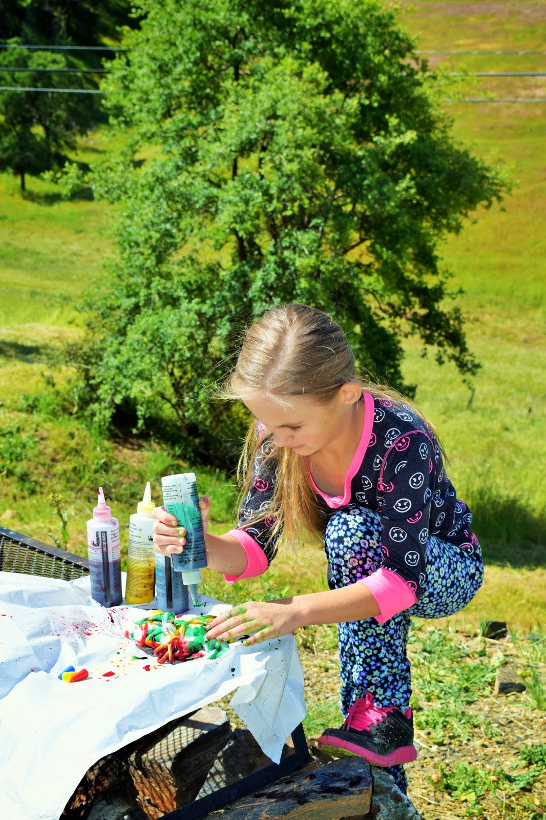 5. Die your shirt. The kit gives you three colors (blue, red, and yellow). There is an extra bottle and it shows you on the bottle how much of what color to mix to get a secondary color. We made green using blue and yellow.