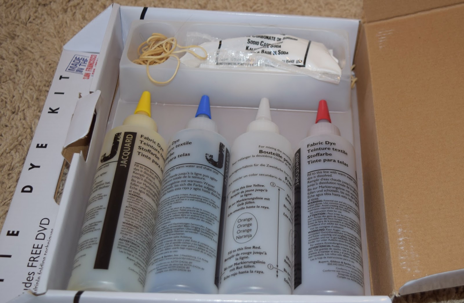 * 3 bottles of dye (red, yellow, and blue)